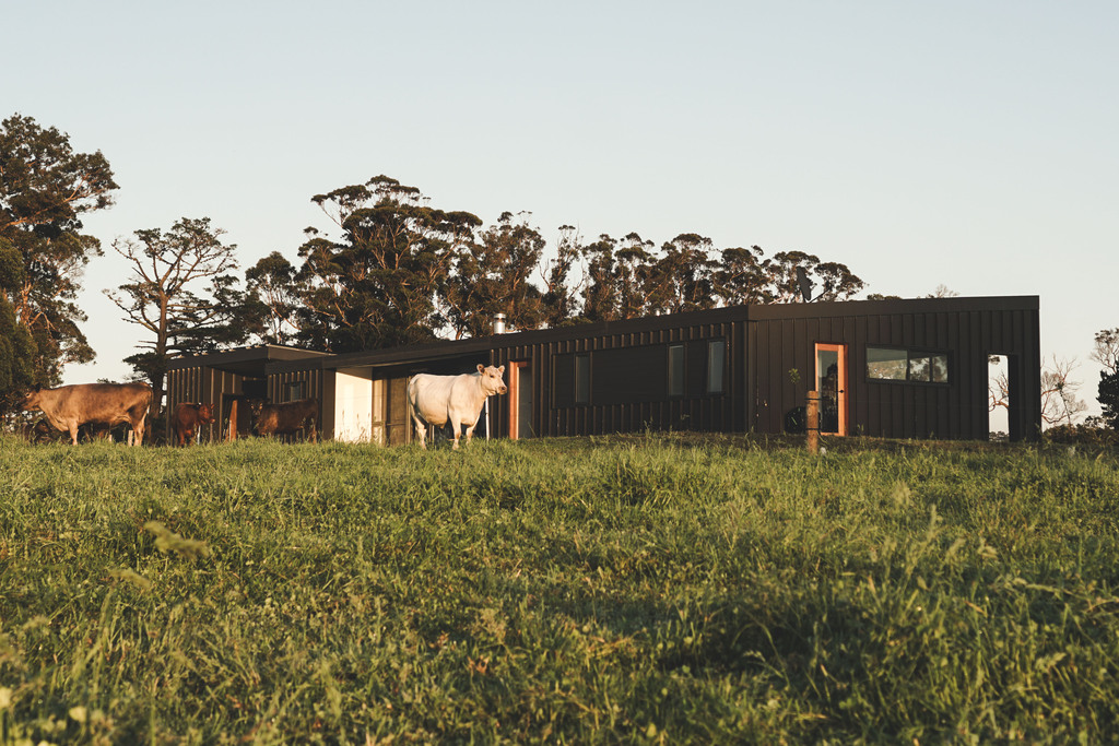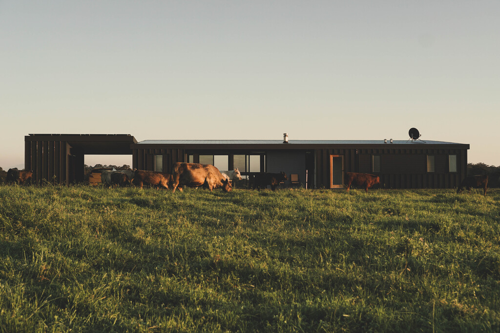 Positioned beside the remnants of the original farm cabin, this off-grid residence is thoughtfully sited to navigate bushfire constraints while capturing expansive northern and southern views. Passive environmental strategies shape the building’s form: northern glazing, extended eaves, and a thermally responsive polished concrete floor ensure stable interior comfort year rOUND. The distinctive hitched roof is designed to admit winter sun while shading the summer heat, and also supports the collection of both solar energy and rainwater, enabling the home to operate entirely self sufficently. A robust, low-maintenance pallet of materials was selected to complement and respond to the demands of the remote, rugged setting.
